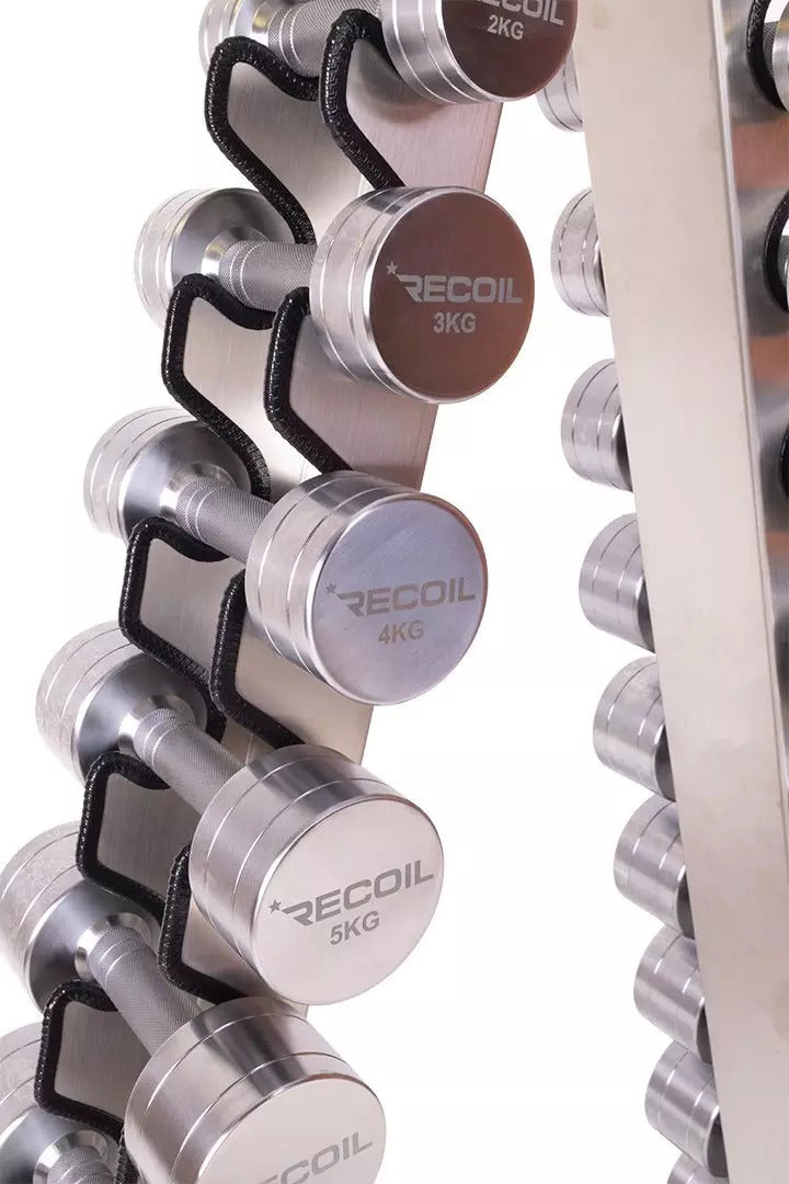 Jokainen käsipaino on valmistettu massiiviteräksestä, jossa on räätälöity kromiviimeistely ja räätälöidyt, uritetut otepinnat – varma ja mukava ote jokaiseen toistoon. Päissä näkyy selkeä painomerkintä sekä Recoilin tunnus.