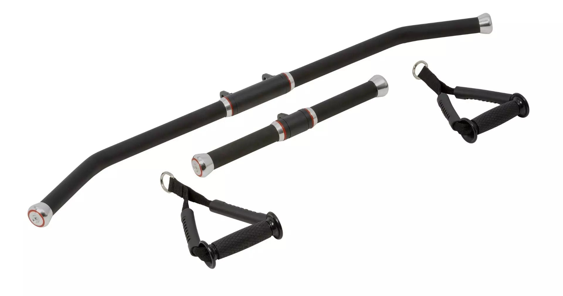 Mukana toimitetaan leveä taljakahva, kapea triceps-kahva sekä kaksi pehmeää vetokahvaa, jotta voit aloittaa treenin heti.