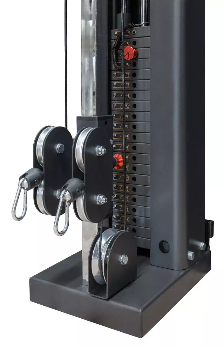 Laite sisältää 95 kg:n painopakan ja 1:2-välityssuhteen molemmille vetokahvoille, mikä tarkoittaa, että harjoittelun kuorma on puolet valitusta painosta – erinomainen ratkaisu, kun haluat pitkän ja hallitun liikeradan. Kun molemmat vaijerit kytketään samaan kahvaan, saat 1:1-välityksen ja pääset harjoittelemaan raskaammilla kuormilla. Näin yhdestä laitteesta löytyy vaihtoehdot sekä voimaharjoitteluun että kuntouttavaan harjoitteluun.