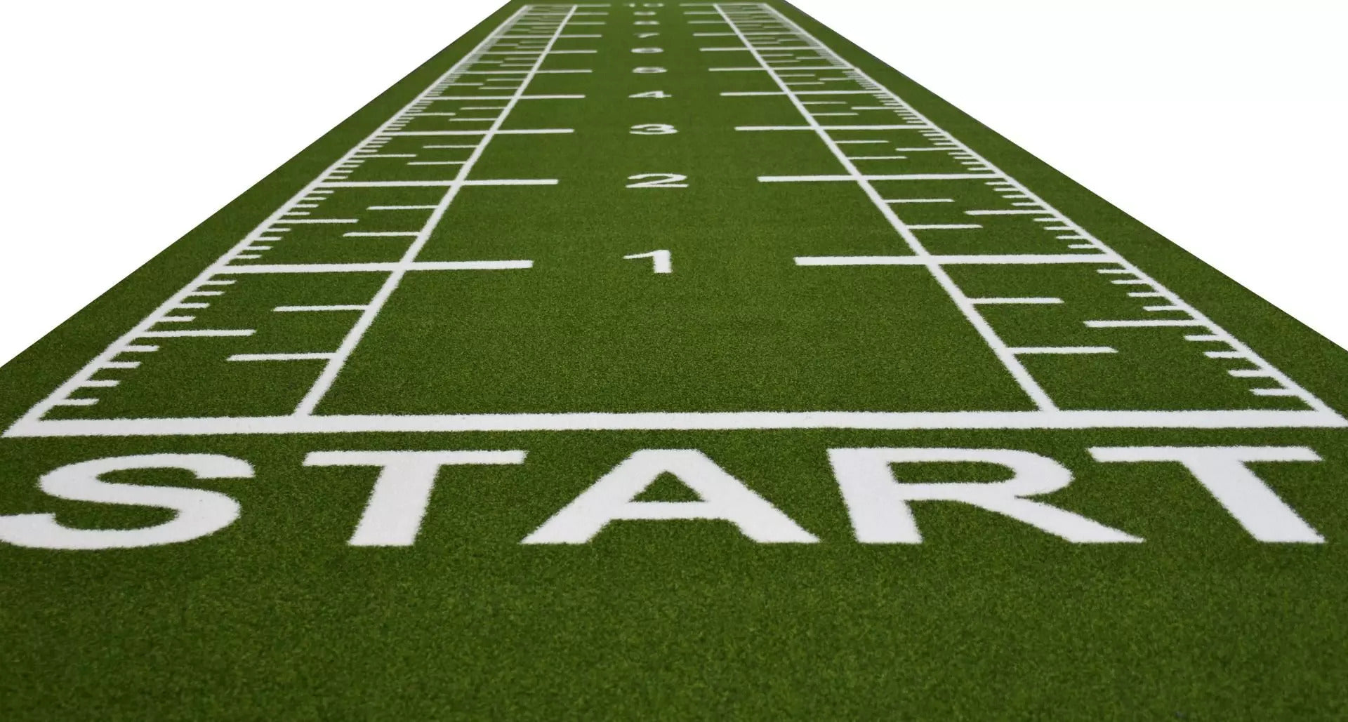 Tämä numeroinnilla varustettu keinonurmi on täydellinen valinta sprinttiharjoitteluun, kelkkavedoille, renkaiden pyörittämiseen ja toiminnallisiin treeneihin. Vihreällä pinnalla on selkeät, valkoiset numerot 1–10, yksi jokaiselle metrille, ja puolimetrin välein tarkat viivat etäisyyden seurantaa varten. Alussa on myös merkitty "START"-alue.