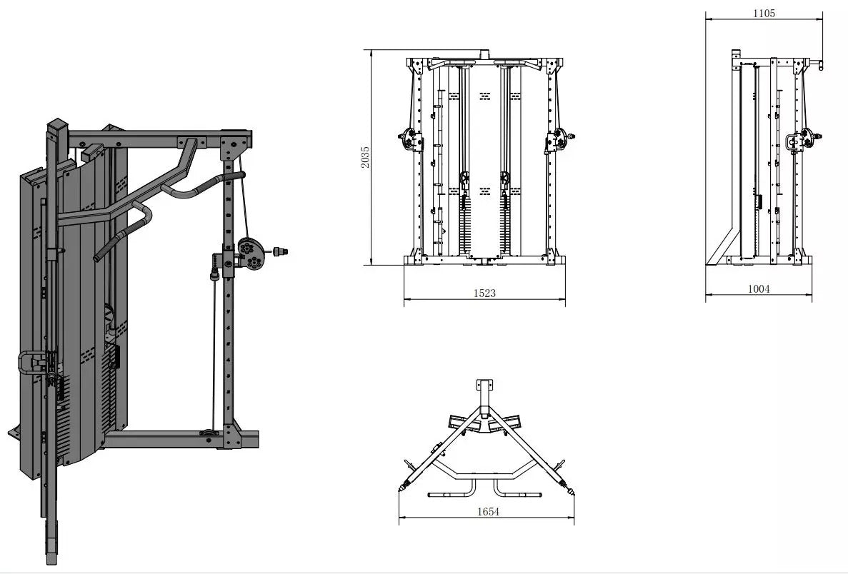 Vaikka mitat ovat vain 152 cm leveä ja 104 cm syvä, jykevä 282 kg kokonaispaino ja täysteräksinen runko takaavat äärimmäisen vakauden kovassakin käytössä. Tyylikäs kokomusta viimeistely sopii sekä yrityssalille, kotikuntoilijalle että taloyhtiön treenitilaan, jossa neliöt ovat rajalliset mutta vaatimukset korkealla.