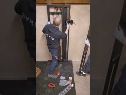 Tuote toimitetaan valmiiksi lähes kokonaan koottuna kestävään puulaatikkoon pakattuna. Asennusta varten tarvitsee vain kiinnittää laite seinään ja asettaa painopakka paikoilleen – kaikki muu on esiasennettu.