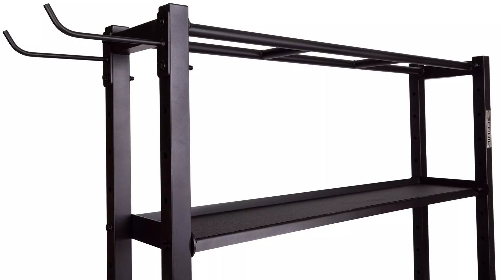 Tukeva taso kahvakuulille – Toinen hyllytaso on syvyydeltään suunniteltu siten, että kahvakuulat pysyvät vakaasti paikoillaan eivätkä rullaa.