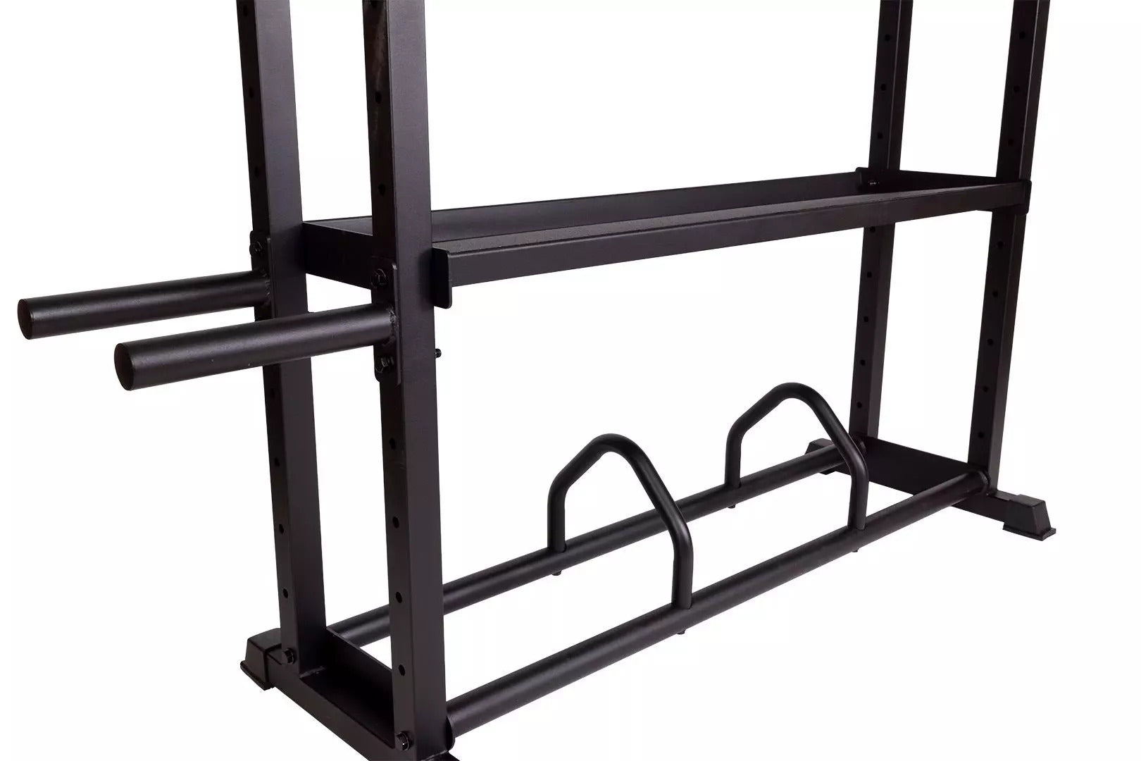 Pystyväli bumper-levyille – Alin taso on pyhitetty levypainoille. Pystysäilytys tekee levyjen käsittelystä vaivatonta – ominaisuus, jota arvostetaan niin toiminnallisessa harjoittelussa kuin perinteisessä voimailussa.