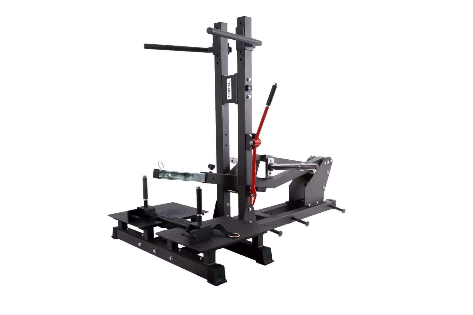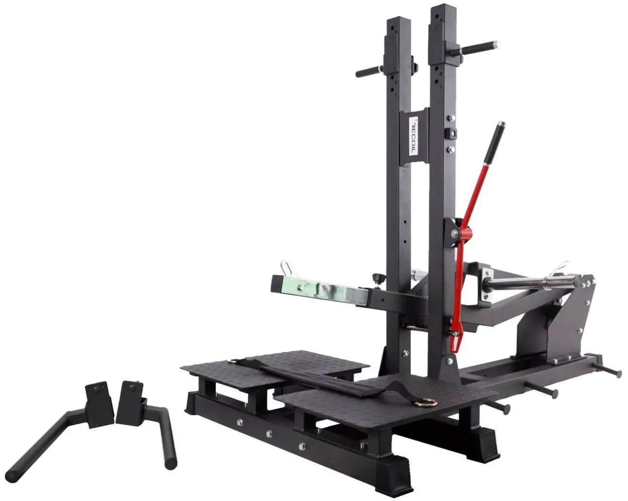 Laite on varustettu karheilla jalkalevyillä, jotka takaavat tukevan ja pitävän asennon harjoituksen aikana. Lisäksi siinä on selkeä punainen start/stop-kahva, joka tekee liikkeen aloittamisesta ja lopettamisesta sujuvaa ja turvallista.